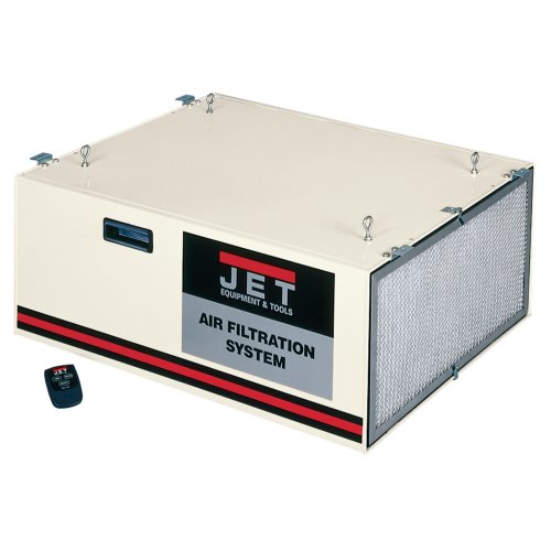 The Jet 3-speed air filtration systems clean and circulate the air in your shop while you work, filtering 98-99 of all particles, five microns in size and 85 of particles one micron in size. And with the timer, you come into your shop, set the timer for two, four or eight hours and forget it. The system automatically shuts down at the time youve set. They use a convenient standard size outer filter, run quietly and come with a remote control for convenience.Grabs 98 of anything from 5 microns up in size and 89 of single micron size particles. Prefilter is 5 micron. Inner filter is 1 micron. Outer filter is a disposable electrostatic filter with a paper frame. Units are designed to be set on a workbench or hung from the ceiling, either tight against the ceiling or hanging from chains. Eyebolts are in place for hanging the unit. The three pocket filter fits inside, and can be blown out. Filters are easily replaced, without tools. The powder coated metal box is heavy duty. Fan and motor are also constructed for durability. Two easy grip handles inset on both sides for ease of handling. Quiet running so it can be left on during work. Model AFS-1000B is 1044 CFM and has 3 speed: 550, 702 and 1044 CFM. The AFS-1000B can filter the air in a 20 x 20 x 8 shop in under five minutes, and filter the air in that size shop a dozen times an hour. Includes a paper filter.This website is a participant in the Amazon Services LLC Associates Program, an affiliate advertising program designed to provide a means for sites to earn advertising fees by advertising and linking to amazon.com